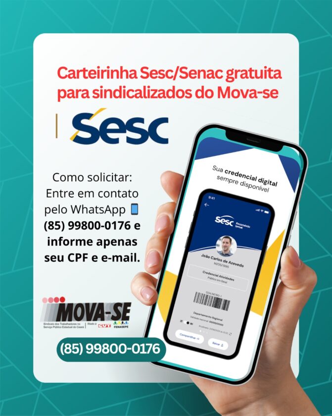 Carteirinha Sesc/Senac gratuita para sindicalizados do Mova-se Sindicalizados do Mova-se têm direito à carteirinha gratuita do Sesc/Senac, que garante acesso a serviços e benefícios em lazer, saúde, educação, cultura, esporte, estética e alimentaç